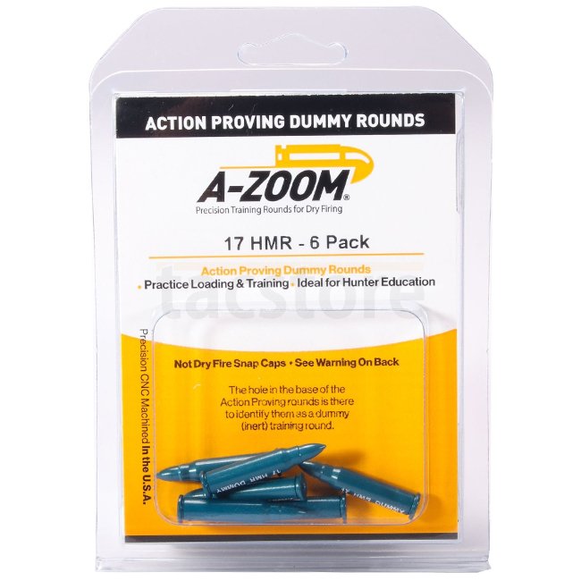 A-Zoom Action Proving Dummy Rounds 17 HMR - Ideal zum Testen von Waffen und Training von Schützen. Präzise dimensionierte, massive Aluminium-Dummy-Runden, keine Platzpatronen. CNC-gefräst für Genauigkeit, hart eloxiert für Langlebigkeit. Wird in der Jäger