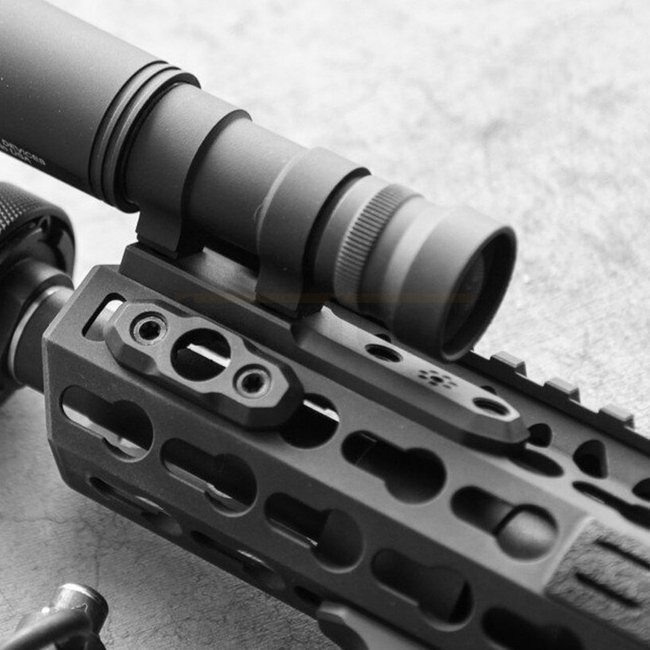 Bei Verwendung auf einer flachen 45-Grad-Winkelmontage ermöglicht es die Inline Scout-Mount dem Benutzer, das Licht näher oder weiter weg von der oberen 12-Uhr-Schiene zu positionieren, um Platz für das Front Sight oder anderes Zubehör zu schaffen. Es sind drei Positionen vorgesehen, die einen Versatz von 0.12 Zoll zu beiden Seiten der Mitte ermöglichen. Die Basis des Surefire Scout Light sitzt nur 0.2 Zoll über der Montagefläche.
