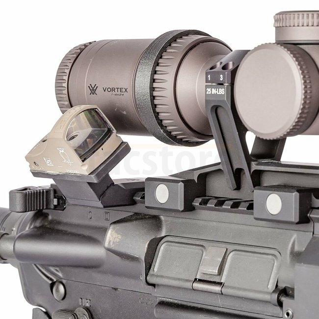 Es werden zwei Plattenhöhen angeboten; Standard (1.5" bis 1.8") und groß (1.9" bis 2.2"). Die Basis- und Optikplatten können umgedreht werden, wodurch die Montage vollständig beidhändig ist. Es wird empfohlen, die Plattenhöhe entsprechend der Primäroptikhöhe zu wählen. Wenn das Zielfernrohr beispielsweise in einer 1.54 Zoll Höhenhalterung montiert ist, wird die normale Höhenplatte für das Red Dot benötigt. Dies gewährleistet eine konsistente Wangenauflage und einen nahtlosen Übergang zwischen der Primäroptik und dem versetzten Red Dot.