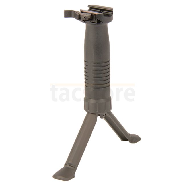 Dieser Vordergriff ist vielseitig. Primär dient er natürlich als Vordergriff, mittels des blitzschnell ausziehbaren Zweibeins kann der Schütze die Waffe zusätzlich bei Bedarf sicher auflegen und so präzise Schüsse auf grössere Distanzen setzen.