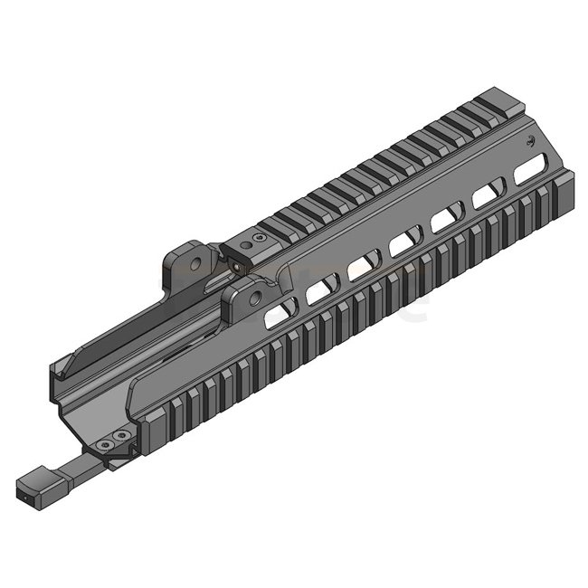 Dieser B&T HK G36 Handschutz ist aus strapazierfähigem Aluminiummaterial mit einer eleganten schwarzen Oberfläche gefertigt. Er verfügt über eine obere Schiene mit einer Länge von 165,6 mm, eine rechte Schiene von 260,5 mm, eine linke Schiene von 260,5 mm