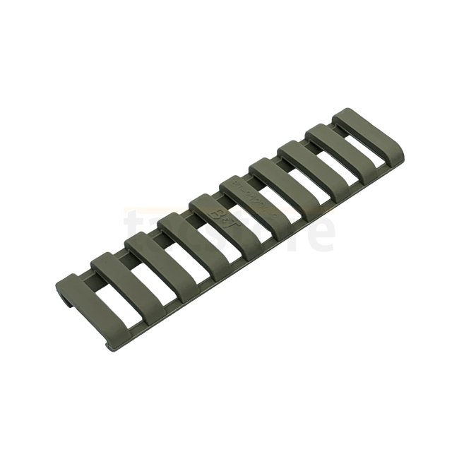 B&T Long Skeleton Gummi-Schienenabdeckung in grüner Farbe. Hitzebeständiges Gummimaterial mit der Teilenummer BT-21204-3. Abmessungen: 95,2 mm x 25,7 mm x 10,9 mm. Gewicht: 7,4 g.