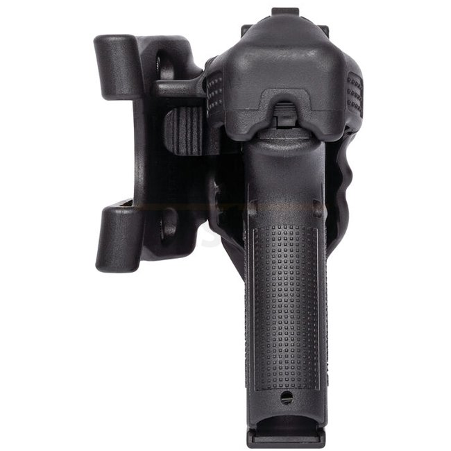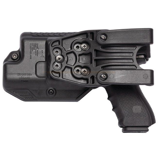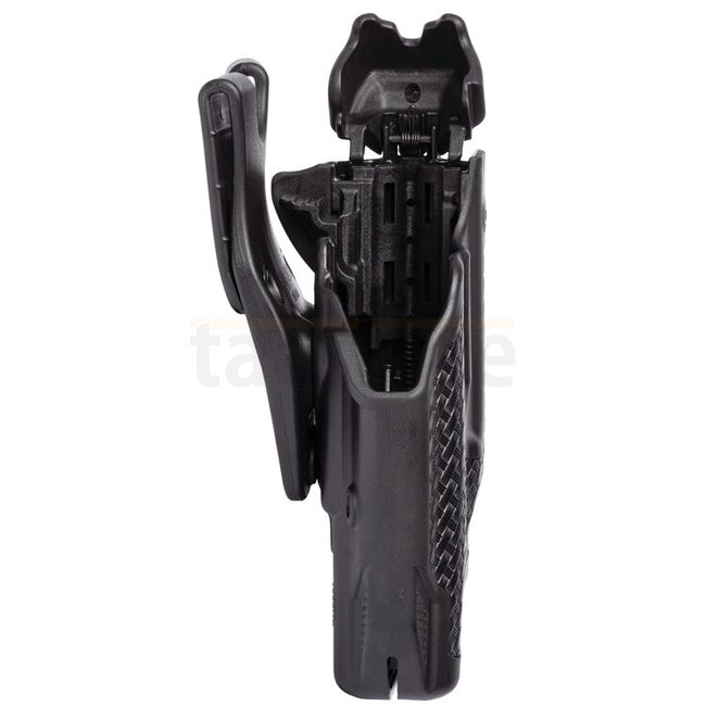 Eine hochwertige Dienstpistolenhalfterung, entworfen für Glock 17/22/31, bietet Schutz der Stufe 3 und ist kompatibel mit Streamlight TLR1, TLR2, Surefire X300, X400. Rechtshändige Ausrichtung in eleganter schwarzer Ausführung.