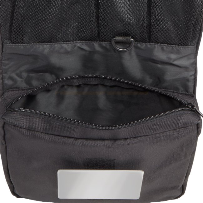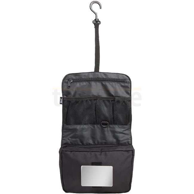 Eine praktische Brandit Kulturtasche Groß in klassischem Schwarz. Ausgestattet mit einem Reißverschlussfach, zwei Netztaschen mit Gummiband, einem großen aufklappbaren Fach mit Reißverschluss, abnehmbarem bruchsicherem Spiegel, Klettfläche, drehbarem Kuns