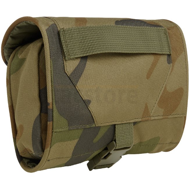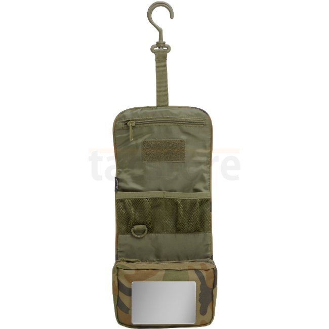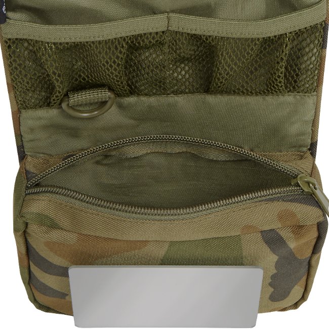 Die Brandit Kulturtasche Medium in Woodland zeichnet sich durch ein vielseitiges Design mit Reißverschlussfächern, Netztaschen, einem bruchsicheren Spiegel und einer Aufhängevorrichtung aus. Perfekt, um Ihre Toilettenartikel unterwegs zu organisieren!