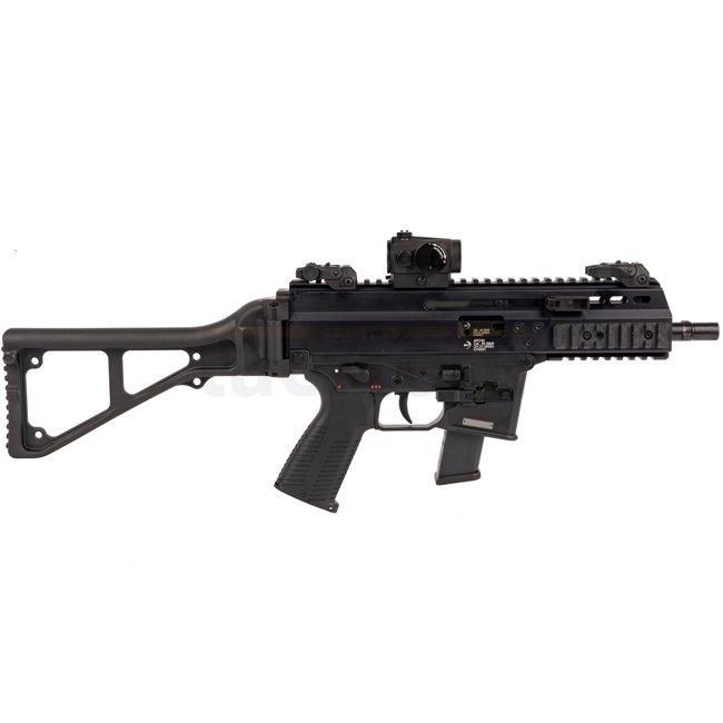 Die B&T APC45 PRO G ist eine moderne Maschinenpistole im Kaliber .45 ACP. Mit einem 175 mm Lauf und einem robusten Schlagbolzenschloss-System bietet sie zuverlässige Leistung und Kontrolle. Ausgestattet mit einem Aimpoint Micro TL Rotpunktvisier, klappbaren Notvisieren und einem beidseitigen, nicht mitschwingenden, klappbaren Spannhebel. Das M4 Unterteil ist kompatibel mit Glock 21 Doppelreihenmagazinen. Der klapp- und teleskopierbare Schaft sorgt für flexible Einsatzmöglichkeiten, während der Mündungsaufsatz mit 3-Lug Schnittstelle die Nutzung geeigneter Schalldämpfer ermöglicht.