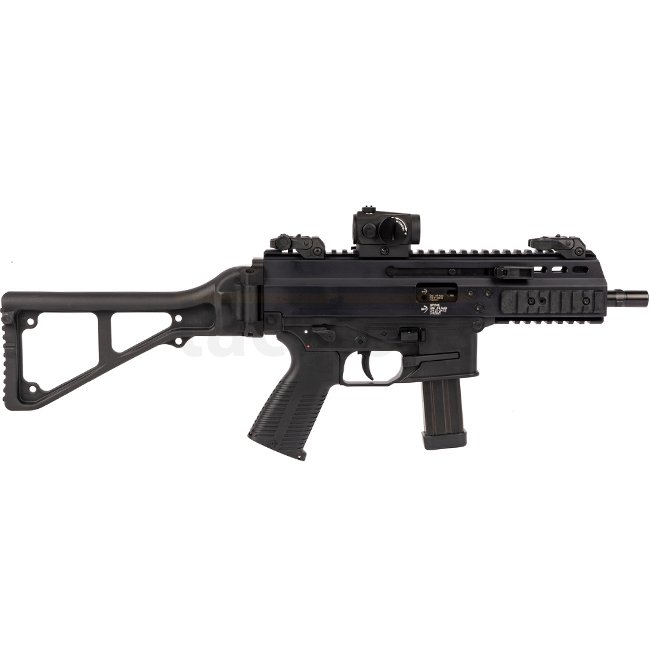 Der B&T APC45 PRO Selbstlade-Karabiner ist ein präzises Waffensystem im Kaliber .45 ACP. Mit einem 175 mm Lauf und einem Schlagbolzenschloss-System bietet er zuverlässiges und kontrolliertes Halbfeuer. Ausgestattet mit einem Aimpoint Micro TL Rotpunktvisier, klappbaren Notvisieren sowie einem beidseitigen, nicht mitschwingenden, klappbaren Spannhebel. Der klappbare Schaft sorgt für kompakte Transportmaße, während der Mündungsaufsatz mit 3-Lug Schnittstelle den Einsatz passender Schalldämpfer ermöglicht.