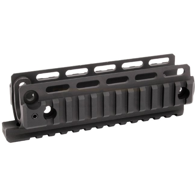 Dieser Handschutz ist eine Sonderversion des bewährten Handschutzes für die MP5. Er ist bei praktisch identischem Aufbau knapp 25% leichter. Er weist drei Picatinny/NAR Schienen auf. Rechts und Links jeweils eine Schiene, sowie eine an seiner Unterseite. Somit können Handgriff, Laser und Lampe je nach Anforderung des Anwenders montiert werden.