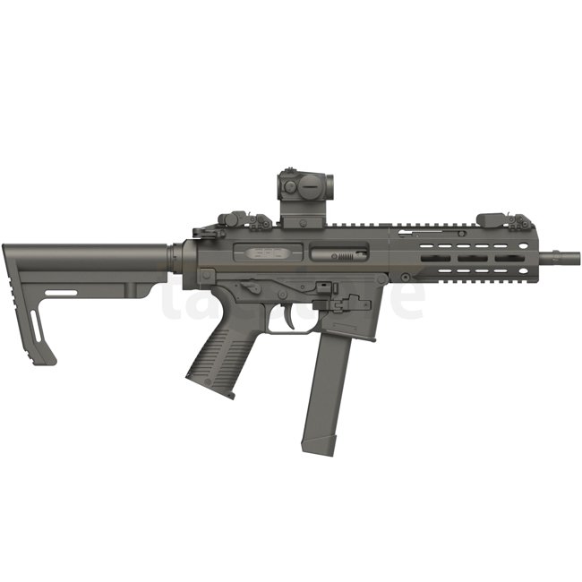 Kompakte halbautomatische Karabiner, B&T SPC9 G, Kaliber 9x19mm, hydraulisch unterstütztes Rückstoßsystem, Länge 626-709mm, Lauf 230mm, Gewicht 2700g mit Visier, einklappbarer und seitlich faltbarer Schaft, beidseitige Bedienung. Inklusive 33-Schuss Magaz