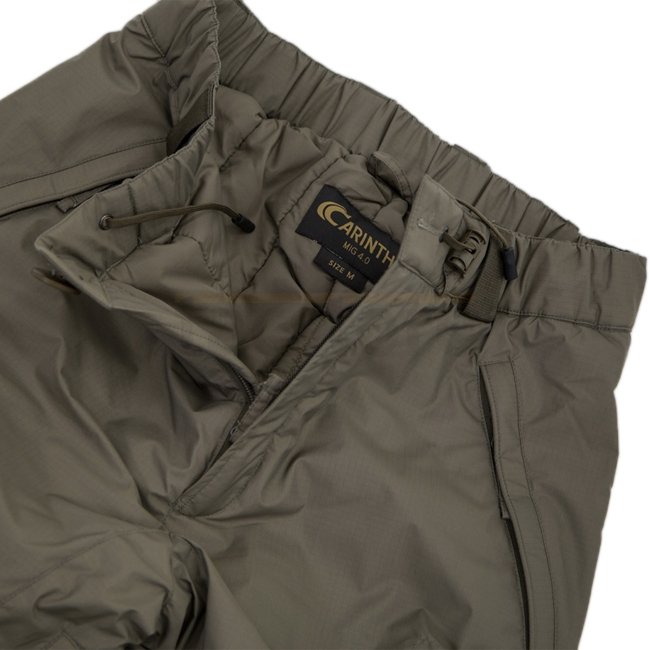 Carinthia MIG 4.0 Hose in Oliv, XL mit verstellbarem Bund, seitlichen Reißverschlüssen, 3D-Taschen, Belüftungsöffnungen, verstärkten Bereichen und einem Kompressionsbeutel. Isoliert mit G-LOFT® und bietet ein Gore Windstopper® Außenmaterial. Erhältlich in