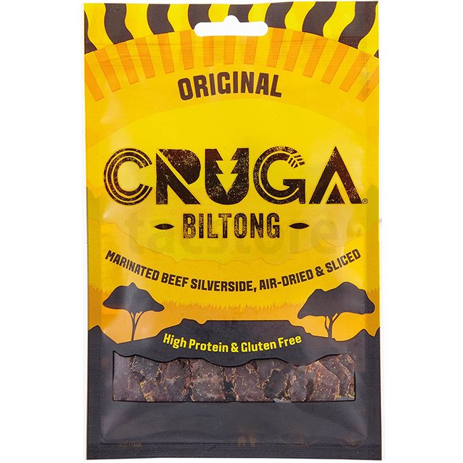 Köstliche marinierte und luftgetrocknete Rinderschultersteakscheiben mit einer perfekten Mischung aus Gewürzen, gewürzt mit Meersalz und einem Hauch von Süße. 70 g Packung von Cruga Biltong Original.