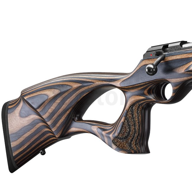 - Schaft: Grau-brauner Daumenloch-Schaft aus laminiertem Holz mit integriertem Abzugsbügel