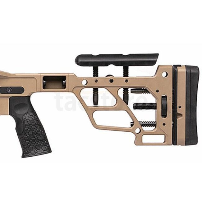 - Modularer kohlefaserverstärkter Schaft mit werkzeuglosen Einstellungen für Wangenauflage und Schaftlänge.