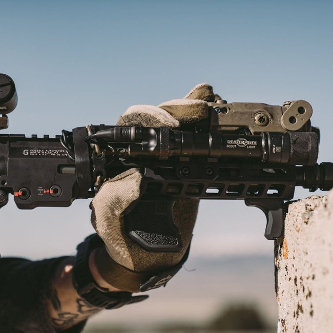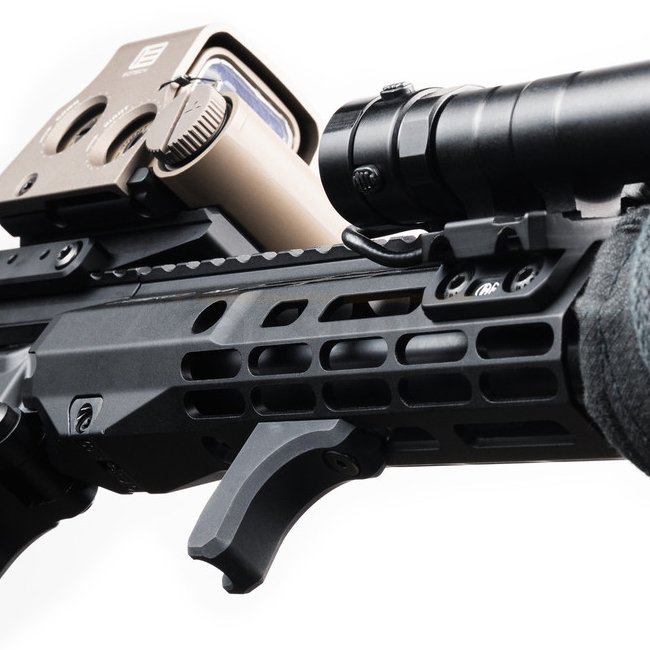 Verbesserte Kontrolle in verschiedenen Griffpositionen, inklusive C‑clamp und Barrikaden‑Stützgriff. Kompaktes Profil für geringes Gewicht und hohe Robustheit.