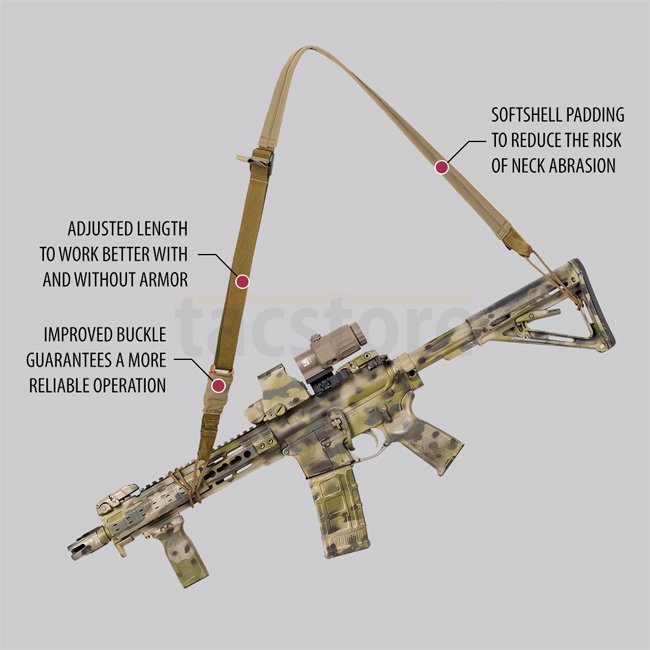 Verbesserte Version des Carbine-Slings. Er bleibt ein Leichtgewicht, optimiert für den Einsatz als 2-Punkt, ist er leicht zu einem Single-Point-Konfiguration umwandelbar. Langlebig, weich im Griff Softshell Halsbereich verhindert Abrieb, auch bei längerem Gebrauch. Neue Version, niedrige Ausfallrate bei der Schnalle.