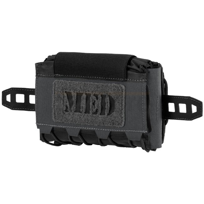Kompakte MED-Tasche Horizontal - Shadow Grey ist ein moderner Erste-Hilfe-Kasten aus Cordura® 500D, 210D Nylon und lasergeschnittenem Laminat. Entworfen, um am Gürtelrücken getragen zu werden, ist sie kompatibel mit MOLLE-Plattformen bis 45mm Breite. Mit