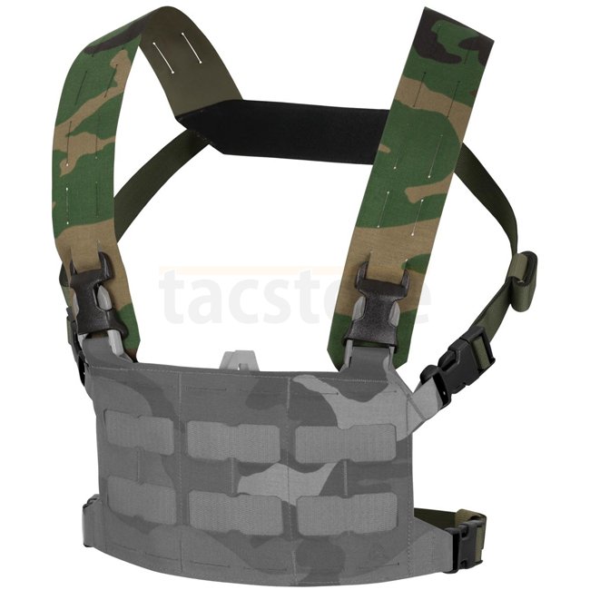 Die Direct Action Front Flap Rig Interface in Woodland besteht aus strapazierfähigem Cordura® 500D / Nylon 210D Laminat. Mit einem Gewicht von 200g ist es ein leichtes und vielseitiges taktisches Zubehör.