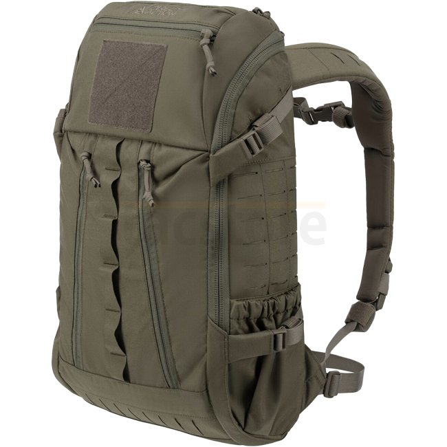Außen befinden sich auf der oberen Klappe zwei kleine Reißverschlusstaschen. Eine davon ist innen mit weichem Velours ausgekleidet, um Kratzer zu vermeiden und eignet sich daher ideal zum Verstauen von Brillen. Auf seiner Höhe befindet sich eine grosse Velcro Fläche, welche eine individuelle Identifizierung oder die Platzierung einer „Freund-Feind“-Markierung ermöglicht. Darunter befinden sich zwei flache Taschen mit diagonalen, vertikalen Reißverschlüssen und einer vertikalen „Daisy Chain“ dazwischen. Unten wird eine schmale MOLLE/PALS Fläche verwendet, um die Anbringung zusätzlicher kleiner Taschen zu ermöglichen. Der Rucksack verfügt außerdem über ein lasergeschnittenes Modulsystem an den Seiten, weclhes drei Reihen und drei Spalten des MOLLE/PALS-Systems entspricht. Unterhalb befinden sich teilweise elastische Taschen zum Tragen von Wasserflaschen oder Feldflaschen. An der Oberseite der Seitenwände befinden sich Löcher für die Durchführung des Trinksystemschlauchs.