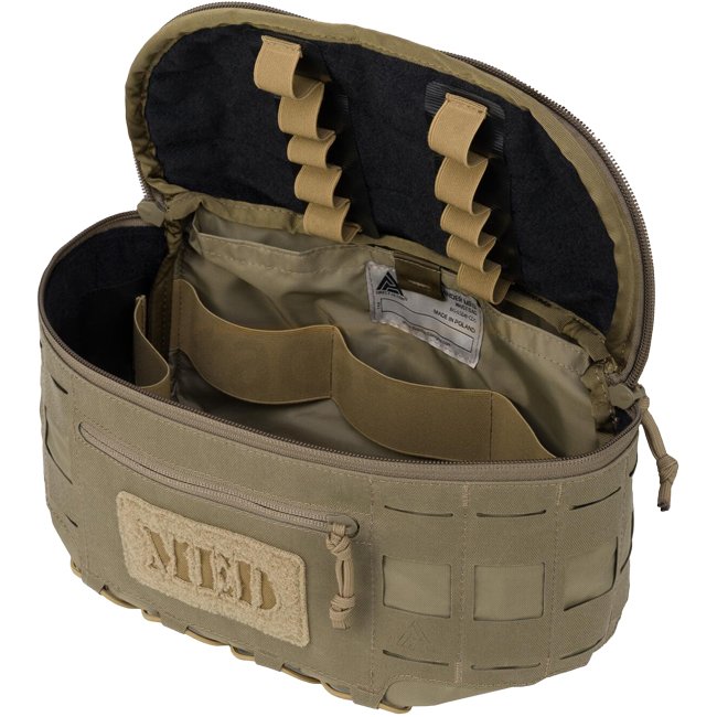 Die Lysander MED-Gürteltasche bietet eine kompakte Möglichkeit, wichtige medizinische Ausrüstung für den Einsatz zu transportieren. Dank ihrer ergonomischen Form passt sie unter den Plattenträger, was besonders nützlich ist, wenn man auf engem Raum operiert. Eine Reißverschlusstasche auf der Vorderseite dient zur Aufbewahrung von Schutzhandschuhen, während an der Außenseite mit Klettverschluss ein medizinisches Pflaster angebracht werden kann. Das Hauptfach lässt sich mit einem Zwei-Wege-Reißverschluss schließen, und sein weiches Klettfutter kann mit den mitgelieferten Spezialstreifen für die jeweilige Ausrüstung leicht konfiguriert werden. Ein weiteres Fach auf der Rückseite der Tasche nimmt große flache Verbände auf und lässt sich mit einem kleinen Klettverschluss schließen. Auf der Verschlussklappe sind zwei weitere Taschen aufgenäht, eine für Scheren und die andere für TCCC-Unfallkarten. An den Seiten der Tasche ist ein lasergeschnittenes MOLLE/PALS-kompatibles System angebracht, an dem weitere Taschen für Verbände, Aderpressen usw. befestigt werden können. Das MOLLE/PALS-kompatible System setzt sich an der Unterseite der Tasche fort, um zusätzliche Ausrüstung wie eine COMBAT STRETCHER zu befestigen. Neben der Verwendung des MOLLE/PALS-kompatiblen Systems an der Unterseite haben wir dort eine eingewebte Schockkordel für zusätzliche Befestigungsmöglichkeiten angebracht.