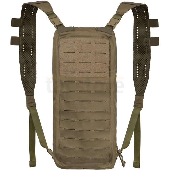 Kompakter und robuster Direct Action Multi Hydro Pack in Coyote Brown, hergestellt aus 500D Cordura mit 2L Kapazität. MOLLE/PALS Montagesystem, leicht mit 256g.