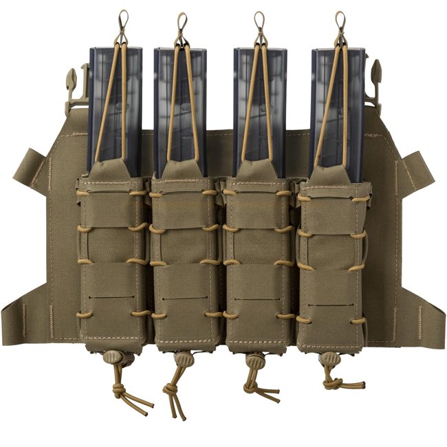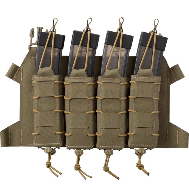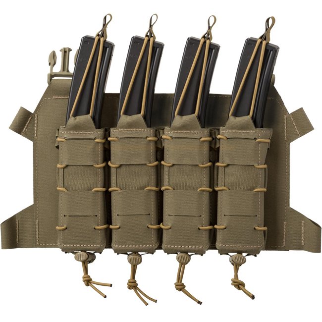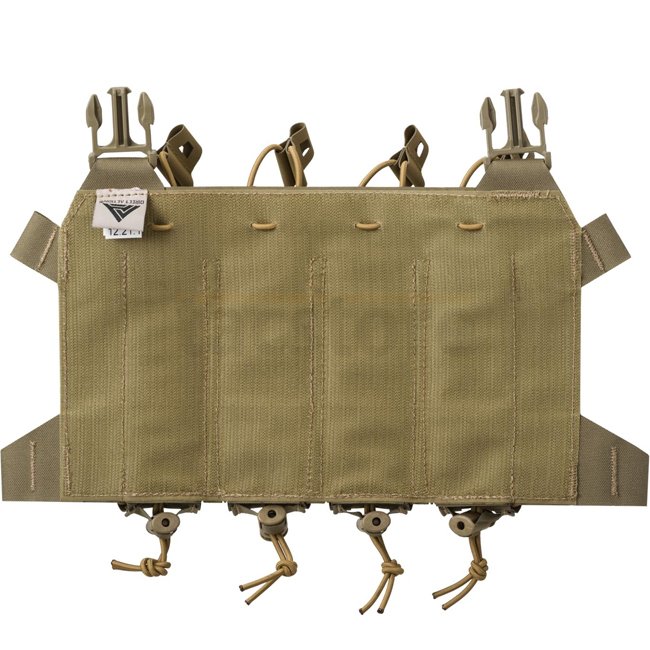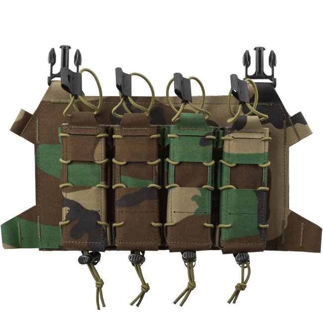 Extrem leichte, skelettierte Klappe zum Tragen von vier SMG-Magazinen. Kompatibel mit MOLLE/PALS und passt zu MP5 oder Scorpion Evo. Hält Magazine sicher mit Bungee-Schnüren und Hypalon-Zuglaschen. Anschließbar an Platten-Träger mit Seitenschnellverschlüs