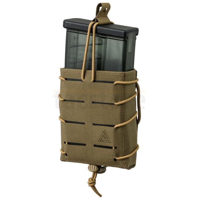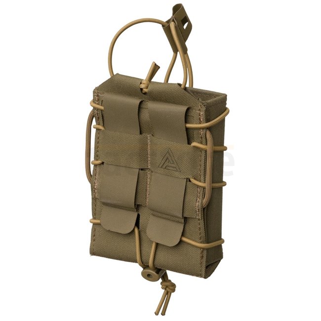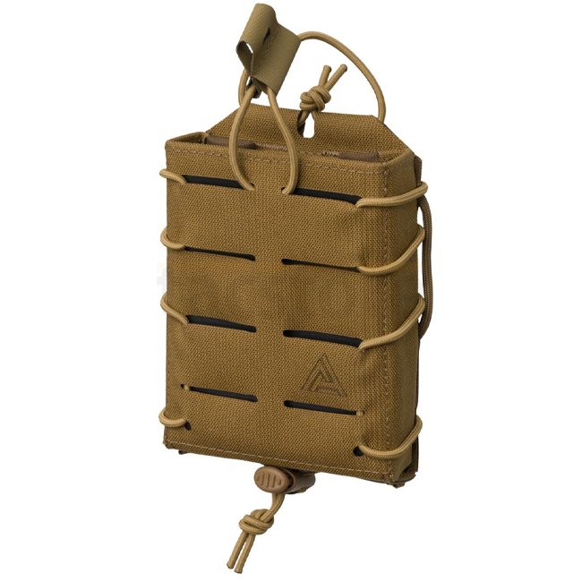 Eine offene Pouch, die für einen schnellen Magazinwechsel konzipiert ist und gleichzeitig einen sicheren Transport des Inhalts gewährleistet. Sie ist für den Transport von .308WIN-Magazinen vorgesehen, einschließlich der breiteren Versionen für das HK-System. Ein innerer Hypalon®-Patch, eine steife Struktur, ein verstellbarer Taschenumfang und elastische Bungee-Seilhalterungen an der Oberseite verhindern, dass Magazine herausfallen. Die Steifigkeit der Tasche ermöglicht ein einfaches Einlegen der Magazine mit einer Hand. Sie ist mit dem MOLLE/PALS-System kompatibel und kann dank speziell entwickelter Paracord-Schlaufen auch an jedem Waffengürtel bis zu einer Breite von 45 mm befestigt werden. Das lasergeschnittene modulare System, das mit MOLLE/PALS kompatibel ist, befindet sich auf der Vorderseite der Tasche und ermöglicht das Stapeln der Taschen übereinander.