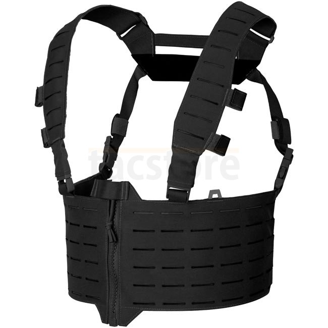 Direct Action Warwick Zip Front Chest Rig in Schwarz. Leichteste, flachste und modularste Brustgarnitur. Perfekte Basisplattform für das Streifenkit, hergestellt aus Cordura 500D Laminat. Merkmale sind lasergeschnittene PALS/MOLLE, Reißverschluss vorne, e