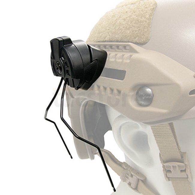 Helmadapter für das M-Lok System wie man sie an Mtek FLUX Helmen findet, passend zu den Earmor M31 und M32 Modellen. Dank einem Drehgelenk kann das Headset bei Nichtverwendung nach hinten auf den Helm geschwenkt werden.