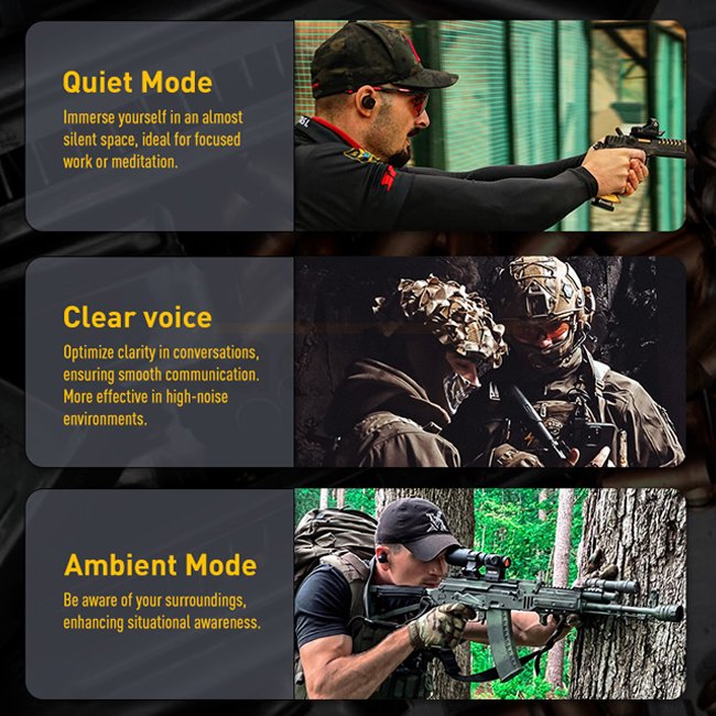 Es gibt zwei Modi für den Innen- und Außenbereich, um den Umgebungssound anzupassen. Es eignet sich für den Einsatz in geräuschintensiven Umgebungen wie Schießtraining, Strafverfolgung, Fertigung und Bauwesen und macht die Arbeit komfortabel und effizient. Die integrierte Bluetooth Funktionalität ermöglicht das Verbinden mit anderen Geräten, das Hören von Musik, das Annehmen oder Ablehnen von Anrufen usw.