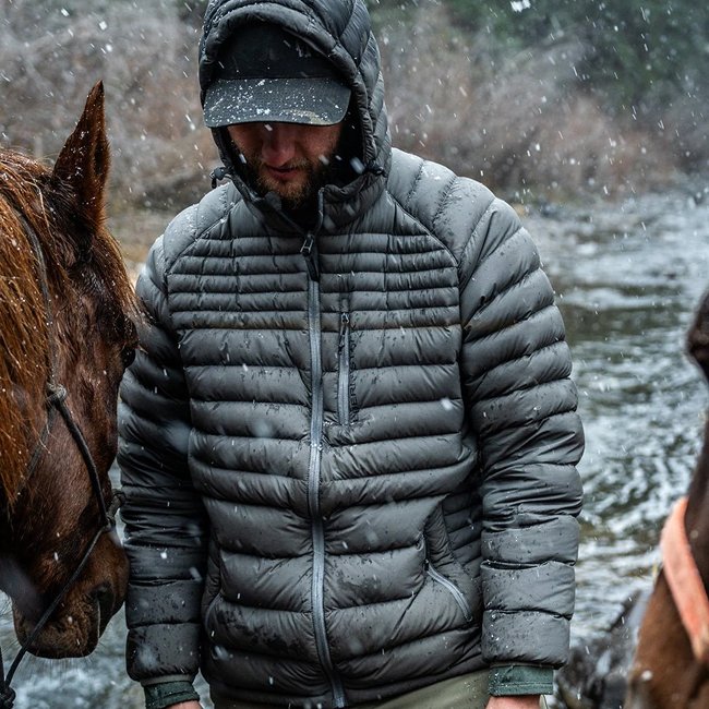 Der McCall Hoody verwendet 850er Gänsedaunen mit Granger-DWR-Behandlung für außergewöhnliche Wärme bei geringem Volumen. Diese Isolierung sorgt für optimale Wärmerückhaltung bei kalten Temperaturen ohne Einschränkung der Bewegungsfreiheit.