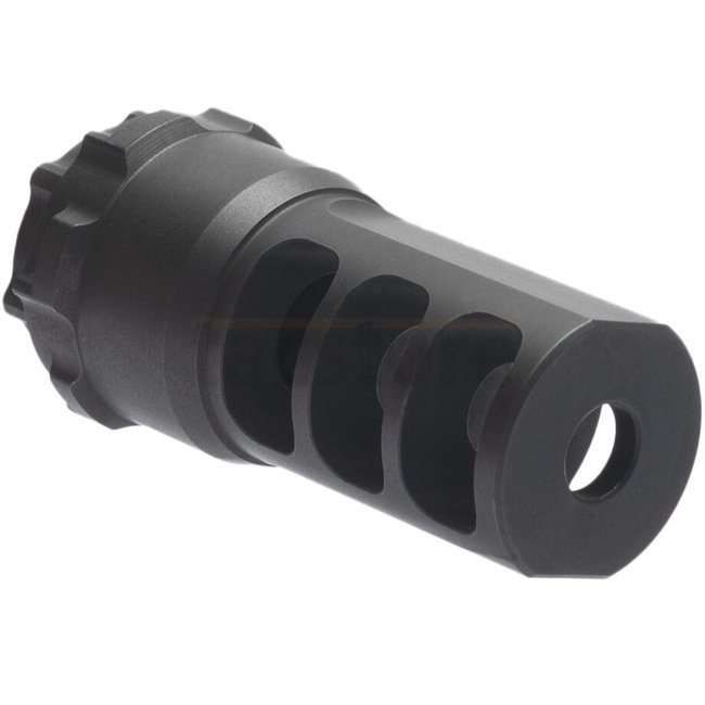 If a weapon is used primarily or exclusively with a silencer, a muzzle brake should be preferred over a flash hider. The three chambers of the muzzle brake divert hot powder gases to the side, resulting in a longer silencer lifespan. If the weapon is used without a silencer, the increased noise generated by the side gas outlet must be taken into account. Especially for people standing next to the shooter, the noise level is significantly higher than when using a flash hider.