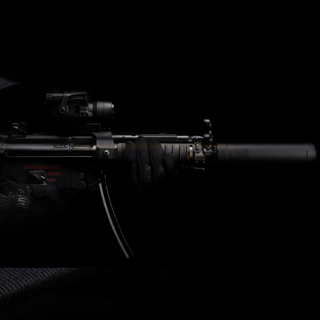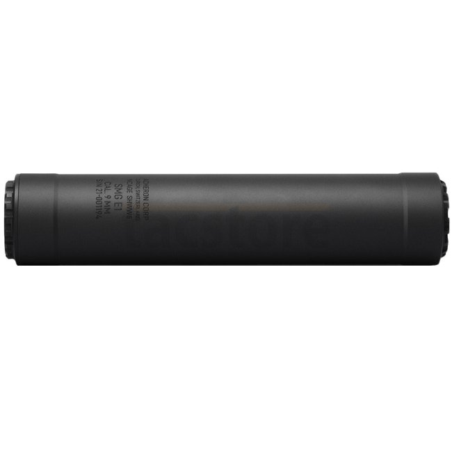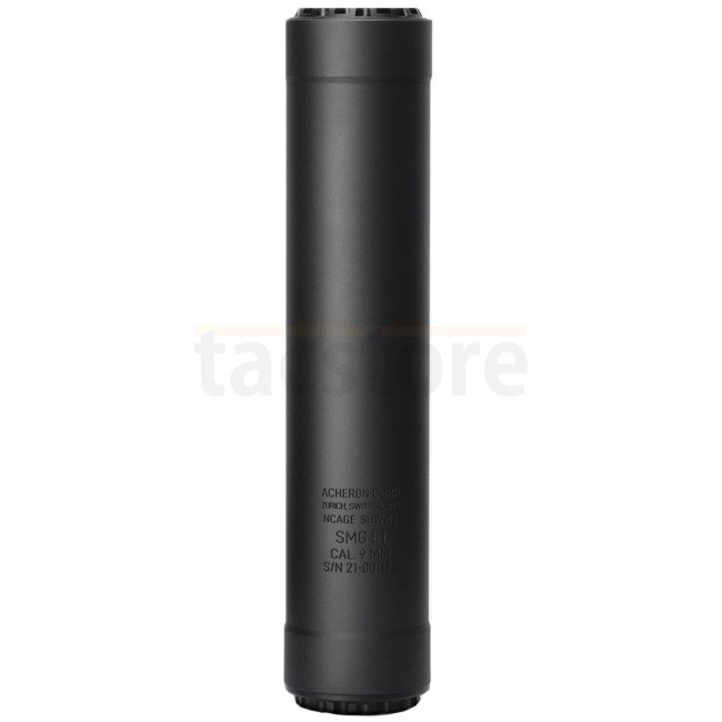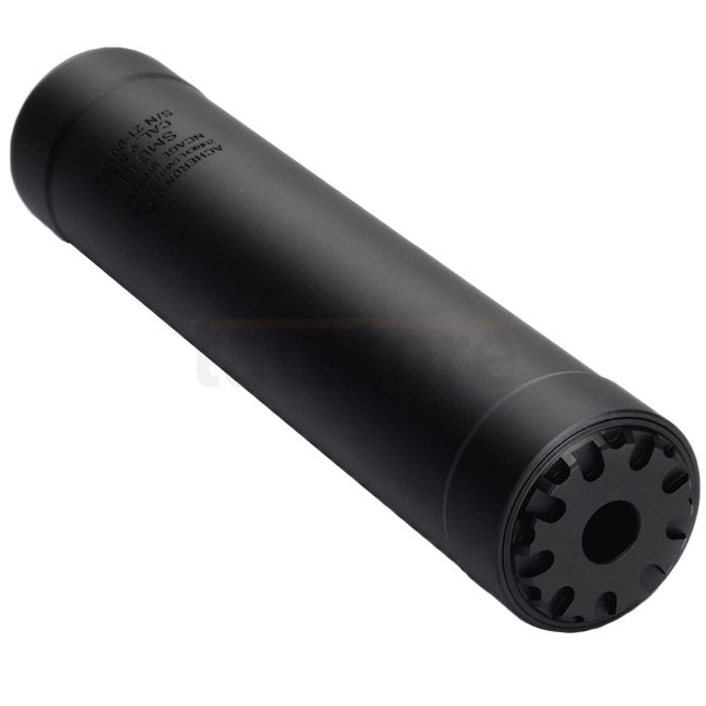 The Acheron SMG E1 Suppressor Trilug 9x19mm - Black is a high-performance suppressor designed for 9x19mm submachine guns. It features a Trilug mounting system for quick attachment, superior noise reduction, and durability. Perfect for tactical scenarios,