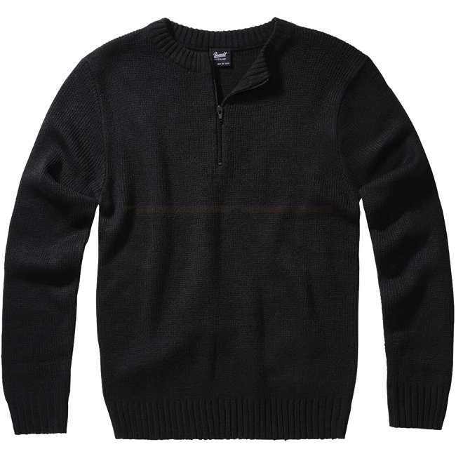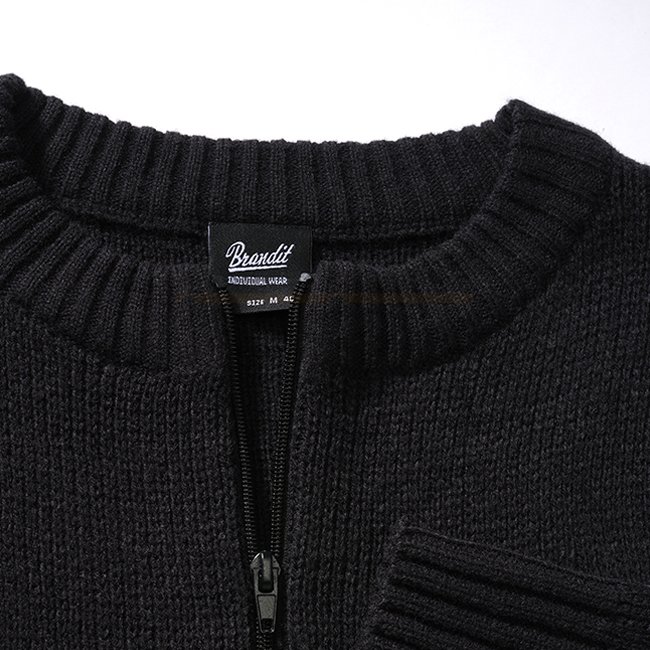 A classic and comfortable round neck sweater with zipper inspired by Swiss Army design. Soft polyacrylic material for a cozy feel. Features knitted cuffs and hem. Perfect for casual wear.