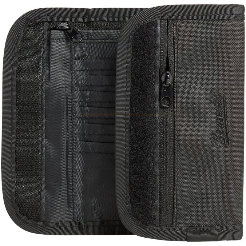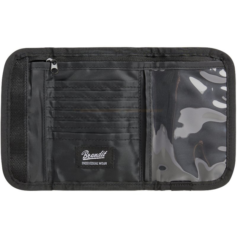 Compact and durable Brandit Wallet Two in Dark Camo featuring a coin compartment, card slots, transparent pockets, banknote compartments, and sturdy polyester construction with chlorofibre coating.