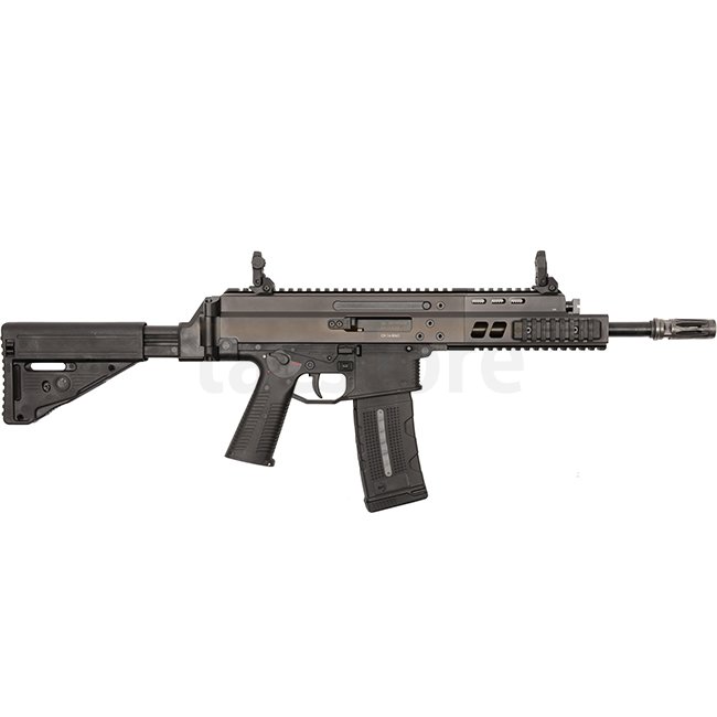 The B&T APC300 Select-Fire Rifle is a versatile weapon system chambered in .300 AAC Blackout. Featuring a 280 mm barrel, foldable emergency sights, a side-changeable reciprocating charging handle, and a foldable and telescopic stock, it is designed for reliability and adaptability. Equipped with a flash hider with Rotex-IIA® suppressor interface, the APC300 delivers modularity and superior performance for professional applications.