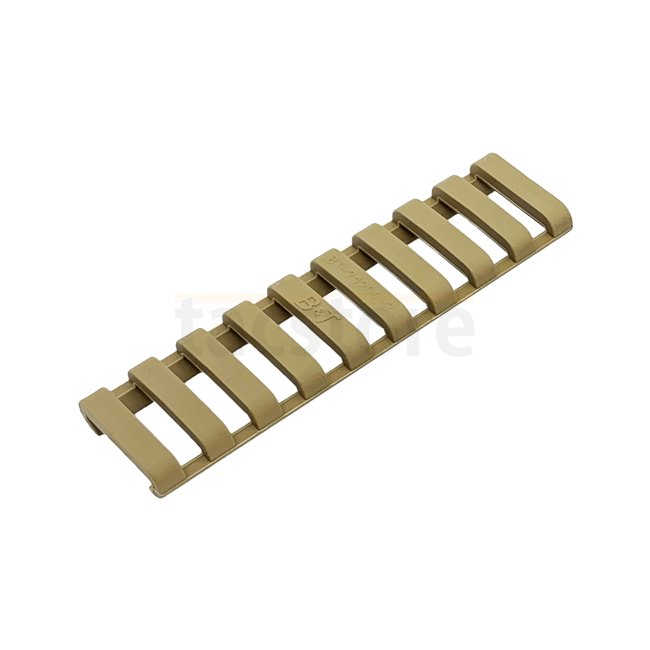 Enhance your rifle's performance with the B&T Long Skeleton Rubber Rail Cover in RAL 8000. Made of durable rubber, this tan cover offers a max height of 10.9 mm, length of 95.2 mm, and width of 25.7 mm. Part number BT-21204-3, this lightweight at 7.4 g co