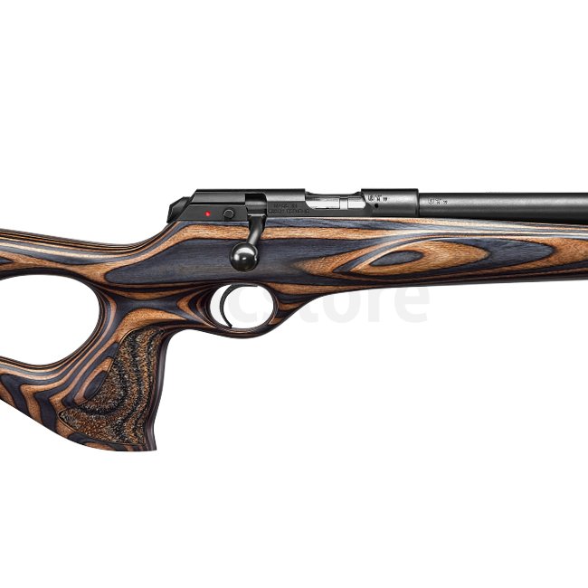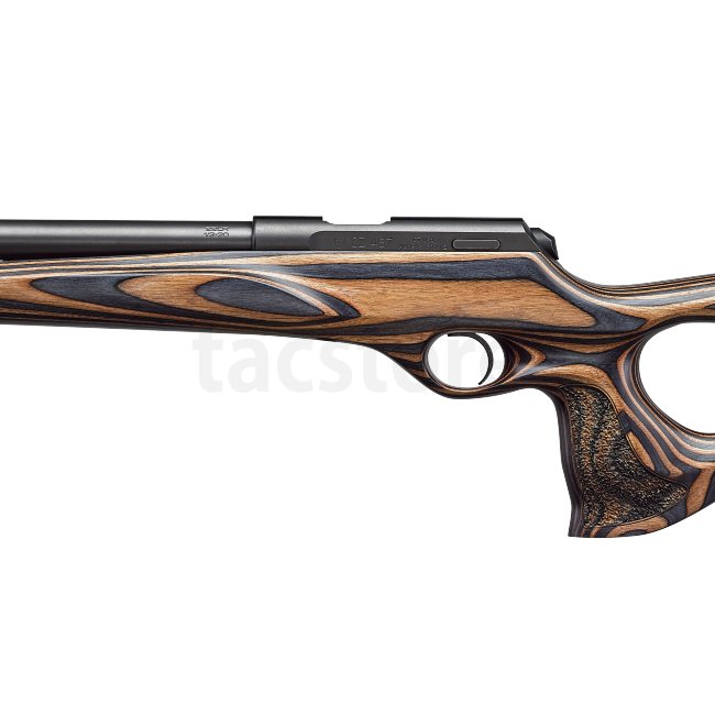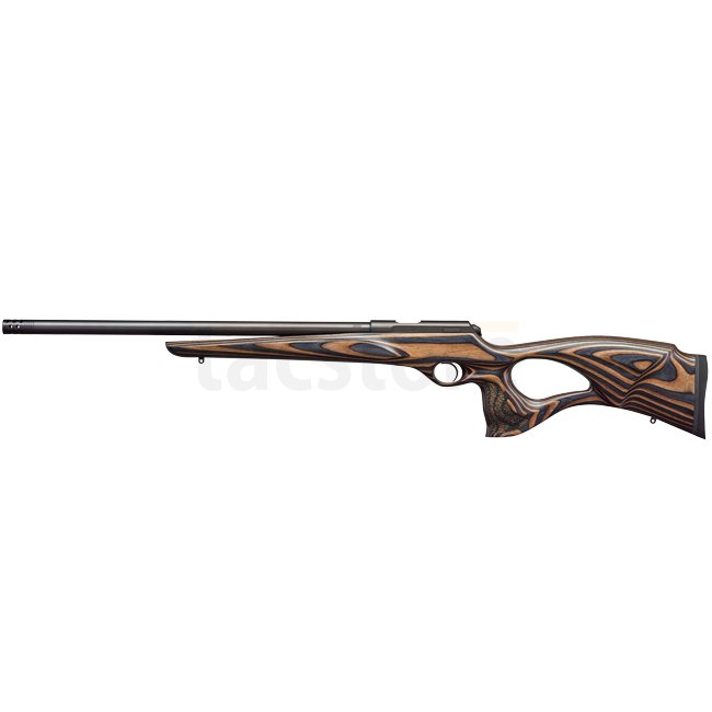 - Stock: Gray-brown laminated wood thumbhole design with integrated trigger guard