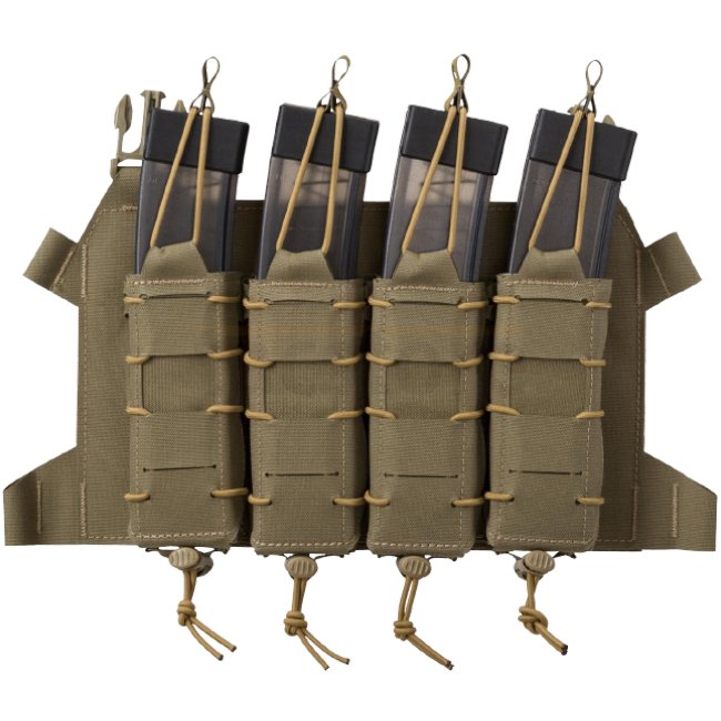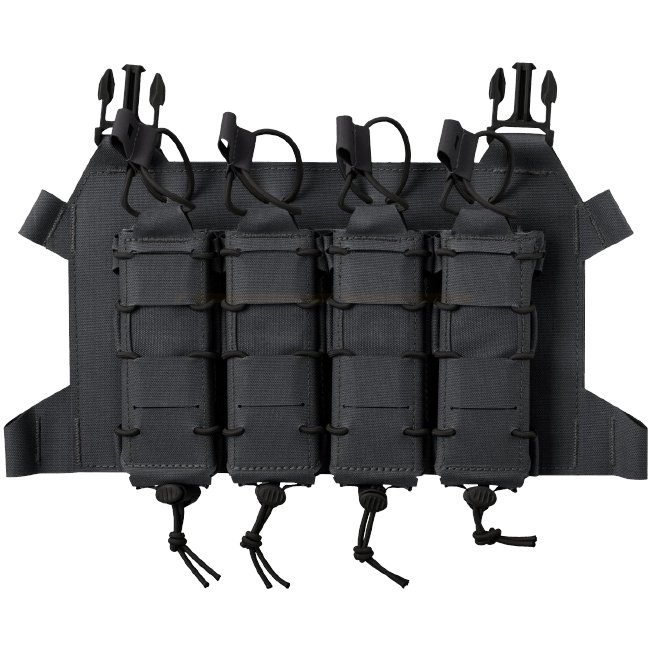 Extremely light skeletonized flap designed to carry four SMG magazines, including MP5 or even Scorpion Evo. Covered with a laser cut modular system compatible with MOLLE/PALS. The flap will work perfectly with the BEARCAT plate carrier and the SPITFIRE system. From the top, the magazines are secured by bungie cords with Hypalon pull tabs. The flap attaches to the plate carrier via two side release buckles. It can be turned into a compact chest rig with an additional interface.