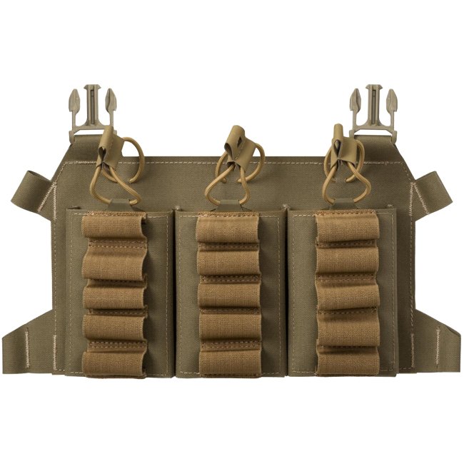 Extremely light, multifunctional skeletonized flap designed to carry three M4/AR15 magazines and up to 15 shotgun shells. Elastic loops with antislip Hypalon backing divide the shotgun ammo into three sections of 5 shells each. Designed specifically for breachers who use the shotgun as an additional weapon. The flap will work perfectly with the BEARCAT platform and the SPITFIRE system. From the top, the magazines are secured by bungie cord with Hypalon handles. This flap can be turned into a compact chest rig via an additional interface.