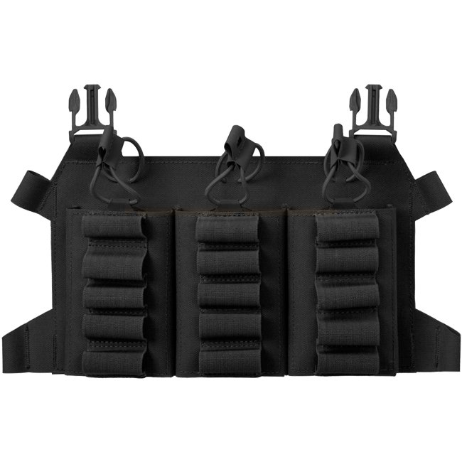 Extremely light, multifunctional skeletonized flap designed to carry three M4/AR15 magazines and up to 15 shotgun shells. Elastic loops with antislip Hypalon backing divide the shotgun ammo into three sections of 5 shells each. Designed specifically for breachers who use the shotgun as an additional weapon. The flap will work perfectly with the BEARCAT platform and the SPITFIRE system. From the top, the magazines are secured by bungie cord with Hypalon handles. This flap can be turned into a compact chest rig via an additional interface.