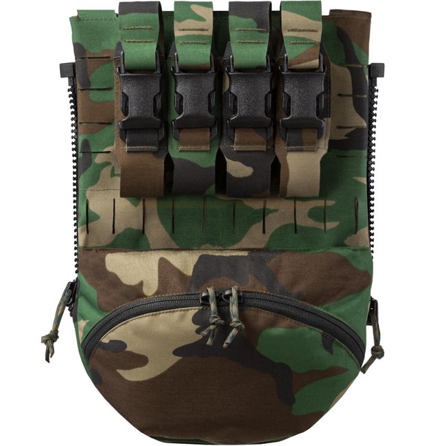 The Direct Action Spitfire Breacher Panel - Woodland is a versatile and customizable back panel for plate carriers, featuring multiple pockets and attachment options for various gear and tools.