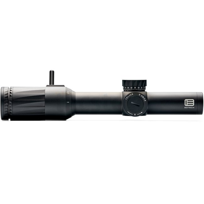 The EOTECH Vudu 1‑6×24 FFP features a durable single-piece 30 mm aircraft aluminum tube with a detachable throw lever for quick magnification changes. It includes a low-profile elevation turret with push/pull lock and a capped windage turret to maintain zero integrity. The illuminated, glass-etched reticle resides in the first focal plane for accurate holdovers at any magnification.
