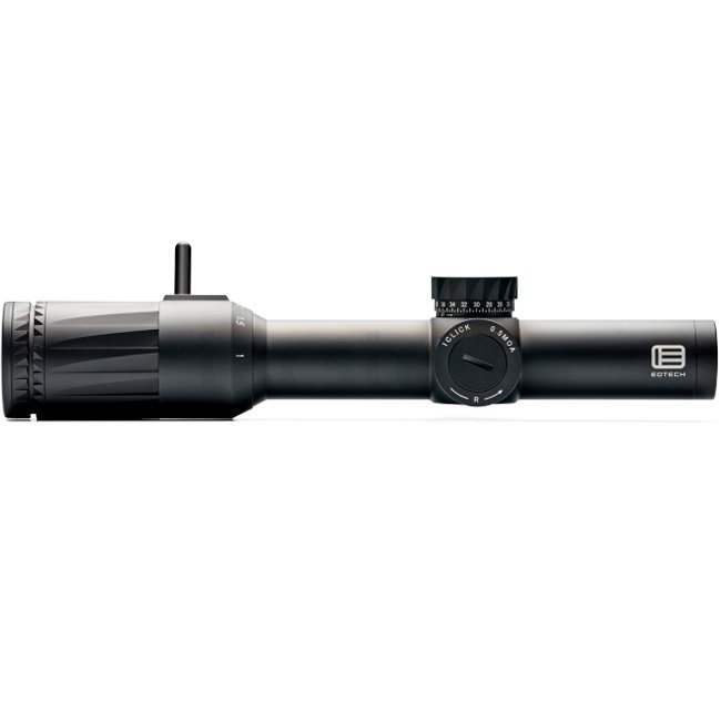 The EOTECH Vudu 1‑6×24 FFP features a durable single-piece 30 mm aircraft aluminum tube with a detachable throw lever for quick magnification changes. It includes a low-profile elevation turret with push/pull lock and a capped windage turret to maintain zero integrity. The illuminated, glass-etched reticle resides in the first focal plane for accurate holdovers at any magnification.