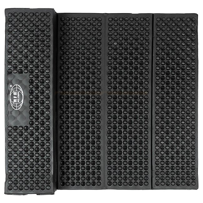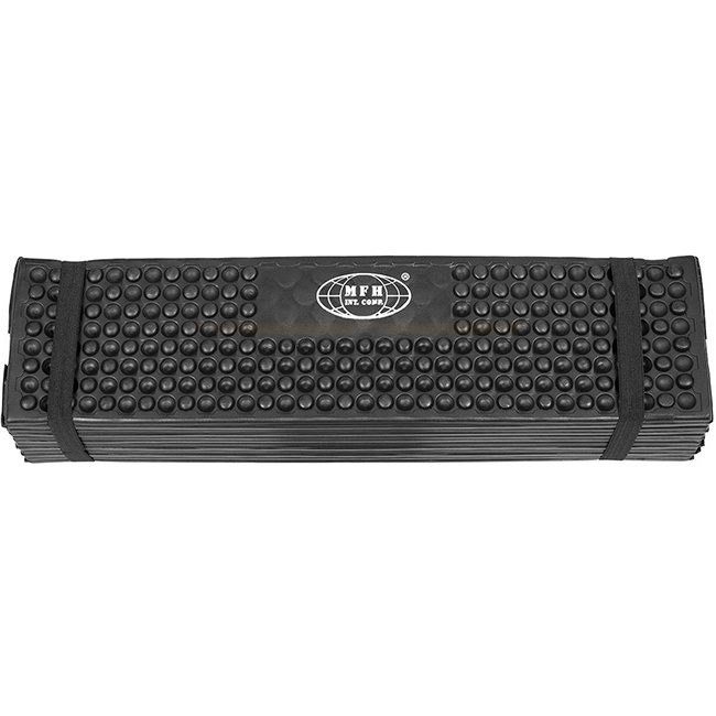 Foldable thermal pad by FoxOutdoor in black with special foam, anti-slip surface, and excellent insulation. Includes 2 detachable elastic straps for easy packing. Measures approximately 180 x 58 x 1 cm when unfolded and folds to ca. 58 x 15 x 11 cm. Weigh