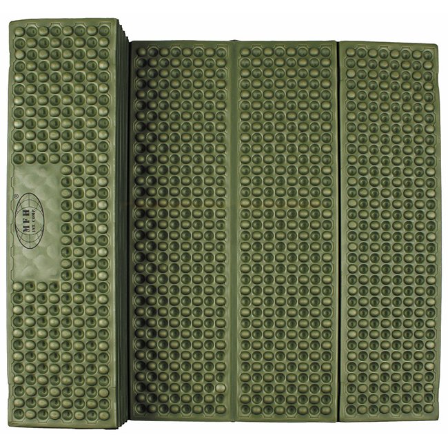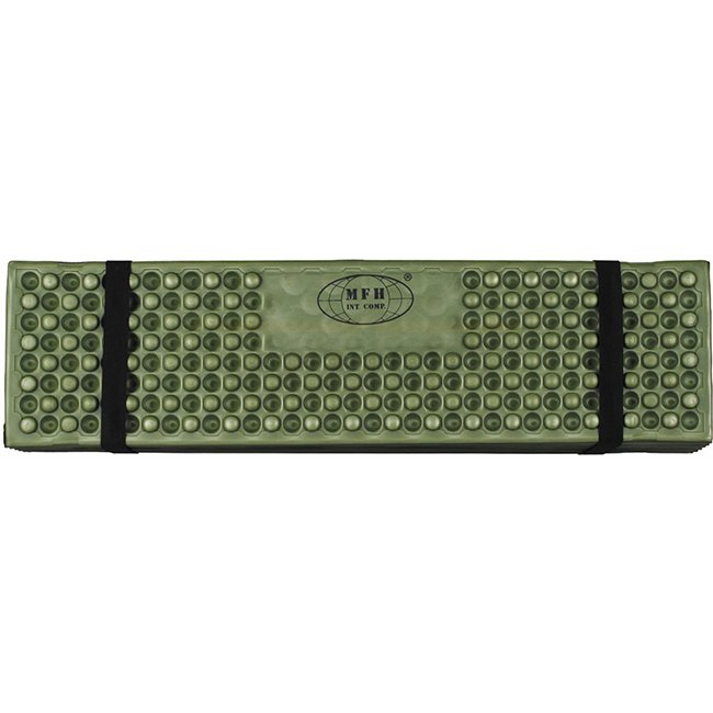 Foldable thermal pad in olive color with sturdy foam, anti-slip insulating structure, 2 detachable elastic straps. Pack size: 58 x 15 x 11 cm, Dimensions: 180 x 58 x 1 cm, Weight: 290g. Material: 100% Ethylene Vinyl Acetate (EVA).