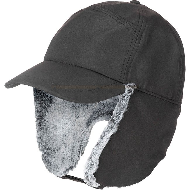 FoxOutdoor Trapper Winter Cap in Black - Cap with earflaps, visor, faux fur earflaps, adjustable drawstring, fleece interior. 100% Polyester material.