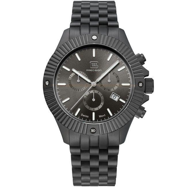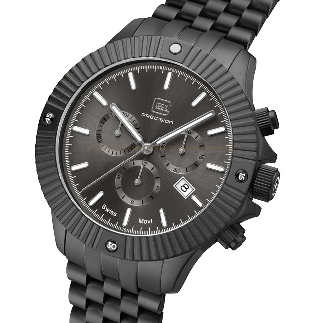 The elegant gunmetal stainless steel case surrounds the color-coordinated dial, protected by scratch-resistant sapphire crystal. The gunmetal stainless steel link strap fits seamlessly into this color scheme. Inside, a Swiss movement ensures lasting precision. Equipped with hands and indices featuring Swiss Super-LumiNova®, a 20 ATM water-resistance rating, and a practical chronograph function, this watch combines functionality and style.