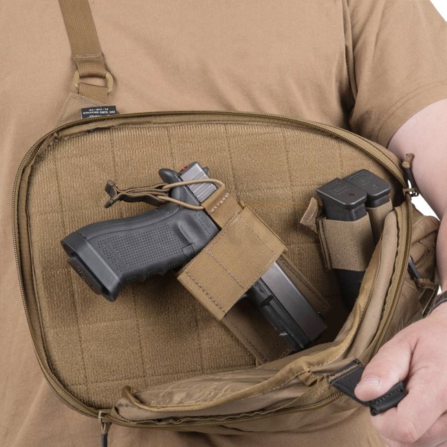 The Helikon-Tex EDC Sling Backpack - Coyote is a compact and versatile sling pack featuring a profiled shoulder strap, hidden weapon carry compartment, YKK zippers, and more. Weight: 570g. Dimensions: 420 x 260 x 60mm.