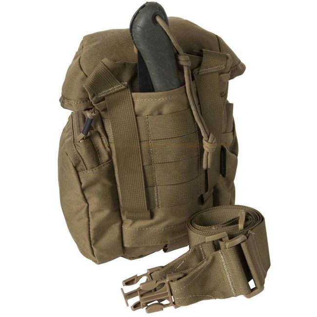The Essential Kitbag® was designed to hold all bushcraft/survival essentials. This bag can hold a water bottle with cup, folding stove, flashlight, compass, cord, sewing kit etc. all neatly organized in separate pockets. On the back is a sleeve that will hold a folding saw, knife or an axe and extra pouches can be attached at the front side via MOLLE. The Essential Kit Bag can be carried attached to backpack or belt via MOLLE/PALS or with its own shoulder strap.