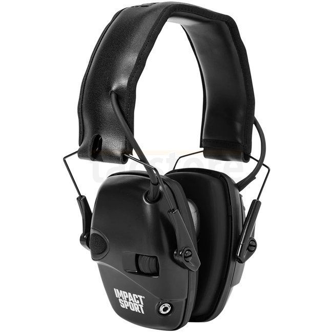 Howard Leight Impact Sport Electronic Earmuff - Black; NRR of 22dB; amplify range commands, low profile earcups, adjustable headband, AUX input, 3.5mm cord, compact folding design, 350 hours of battery life.